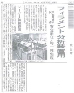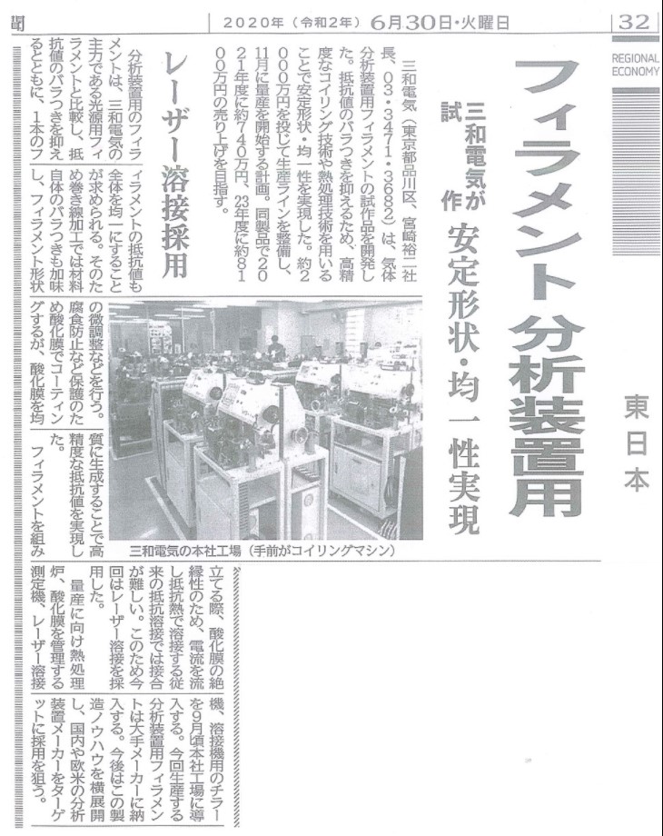 「三和電気、分析装置用フィラメント試作 安定形状・均一性実現」