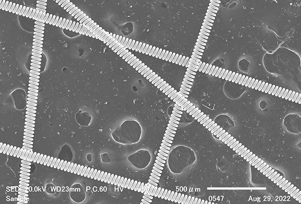 長年に亘る微細なフィラメント生産で培ってきた巻き線の技術を応用し、わずかφ0.003mmの金属線を外径φ0.036mmのコイルに仕上げる事が出来ました。丸線はもちろんのこと、平線を使ったマイクロコイルも手掛ける事が可能で、現在は極小スプリングや、電子部品としても使用されています。市場のニーズを受け、これからもより小さなコイルを生み出すべく技術を高めて参ります。